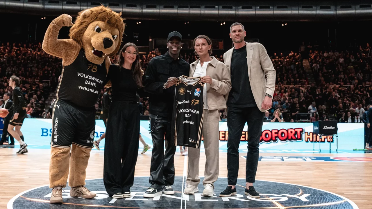 Auf dem Bild v.l.n.r.: Henri, Lisa Horstmann (Head of Marketing & Communications bei NEW YORKER), Dennis Schröder (Löwen-Hauptgesellschafter), Jonas Gnauck (Geschäftsführer von NEW YORKER), Nils Mittmann (Geschäftsführer Basketball Löwen). Foto: Christian Schlüter